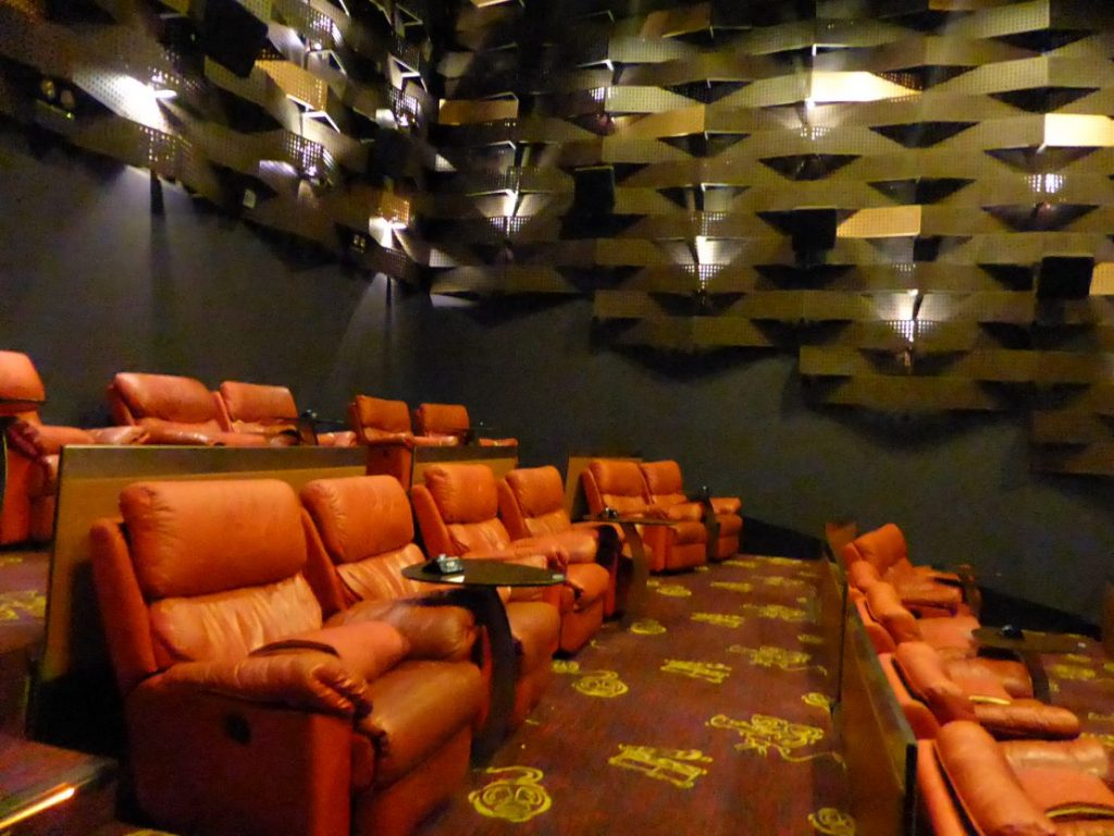 When we went to find the theater, we accidentally wandered into a nice lounge. This is where the “First Class” customers, or the “Gold Class,” wait before their movie. We weren’t sure where we were, so we made our way into the Gold Class theater. Inside were only about twenty seats or so. However, these weren’t your typical movie seats, they were expensive La-Z-Boy recliners equipped with coffee tables, service buttons, and blankets.