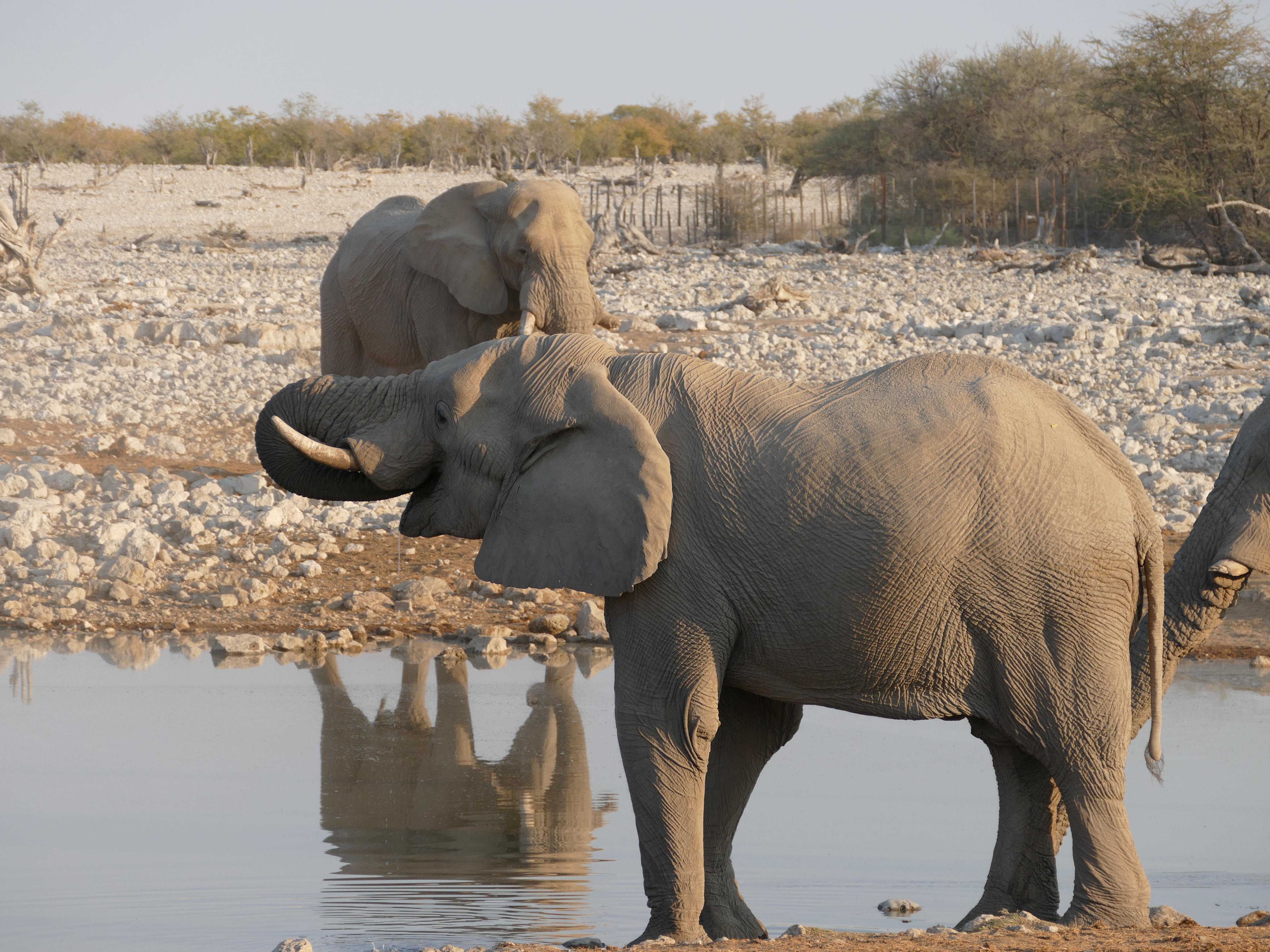 However, the best part of the Okaukuejo Rest Camp is the watering hole right at the edge of camp. You don’t have to go on game drives to see the animals. You can sit on the benches surrounding the watering hole and the wildlife actually comes to you!